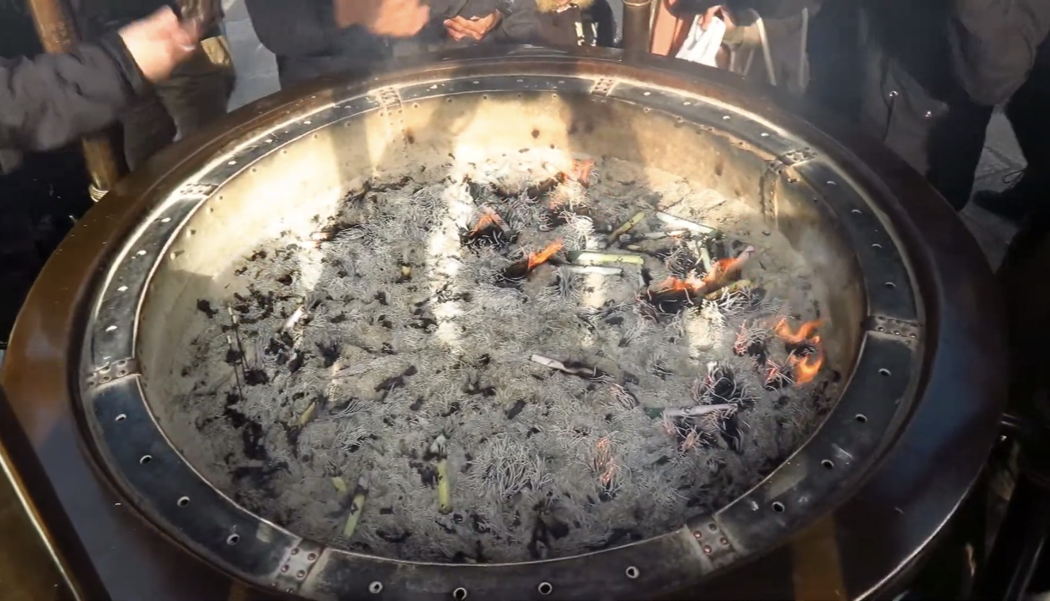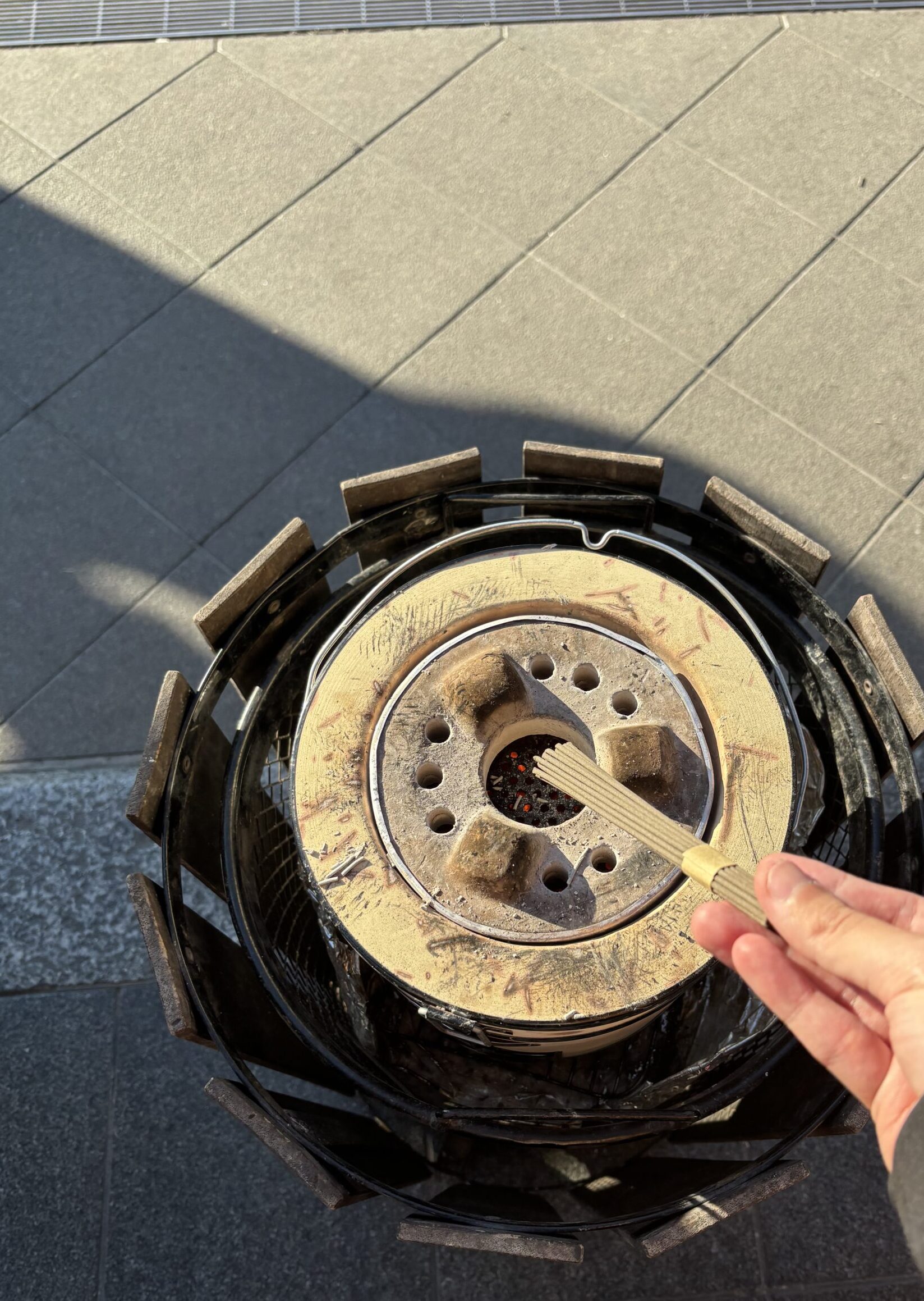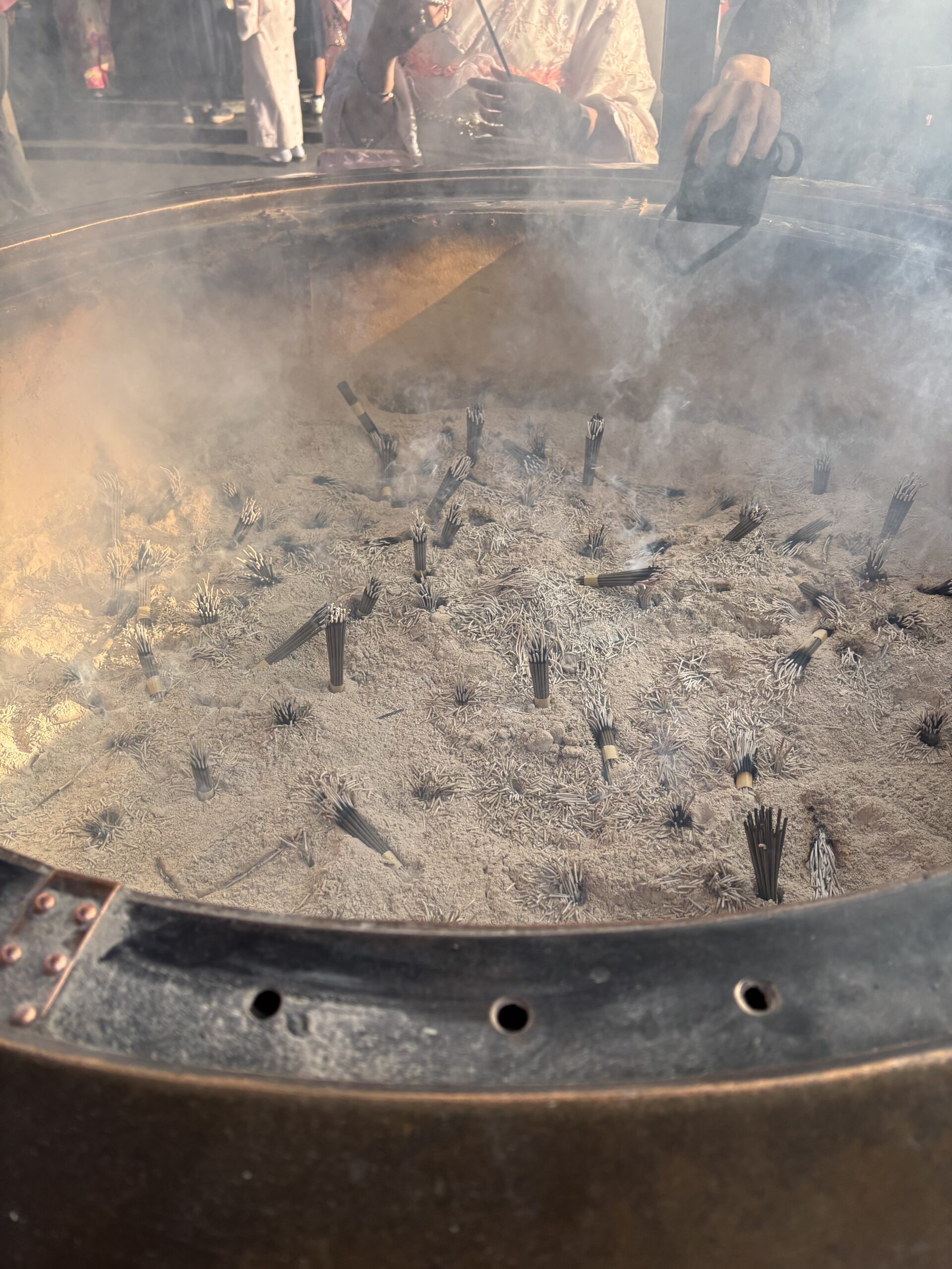 これは常香炉(じょうこうろ)と言うものです。常香炉の煙は、身体の穢れを落とすと言い伝えられており、身体の悪いところに煙を浴びて治りを早めてくれると言い伝えられています。