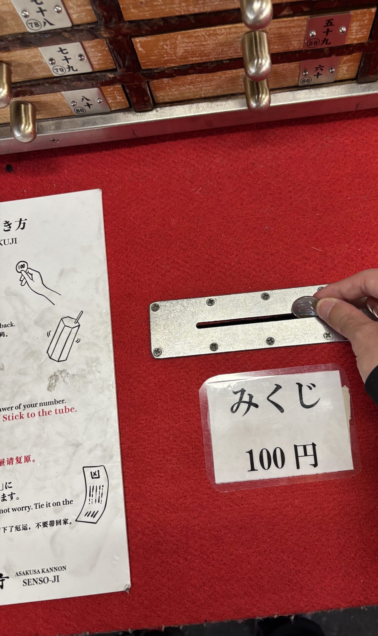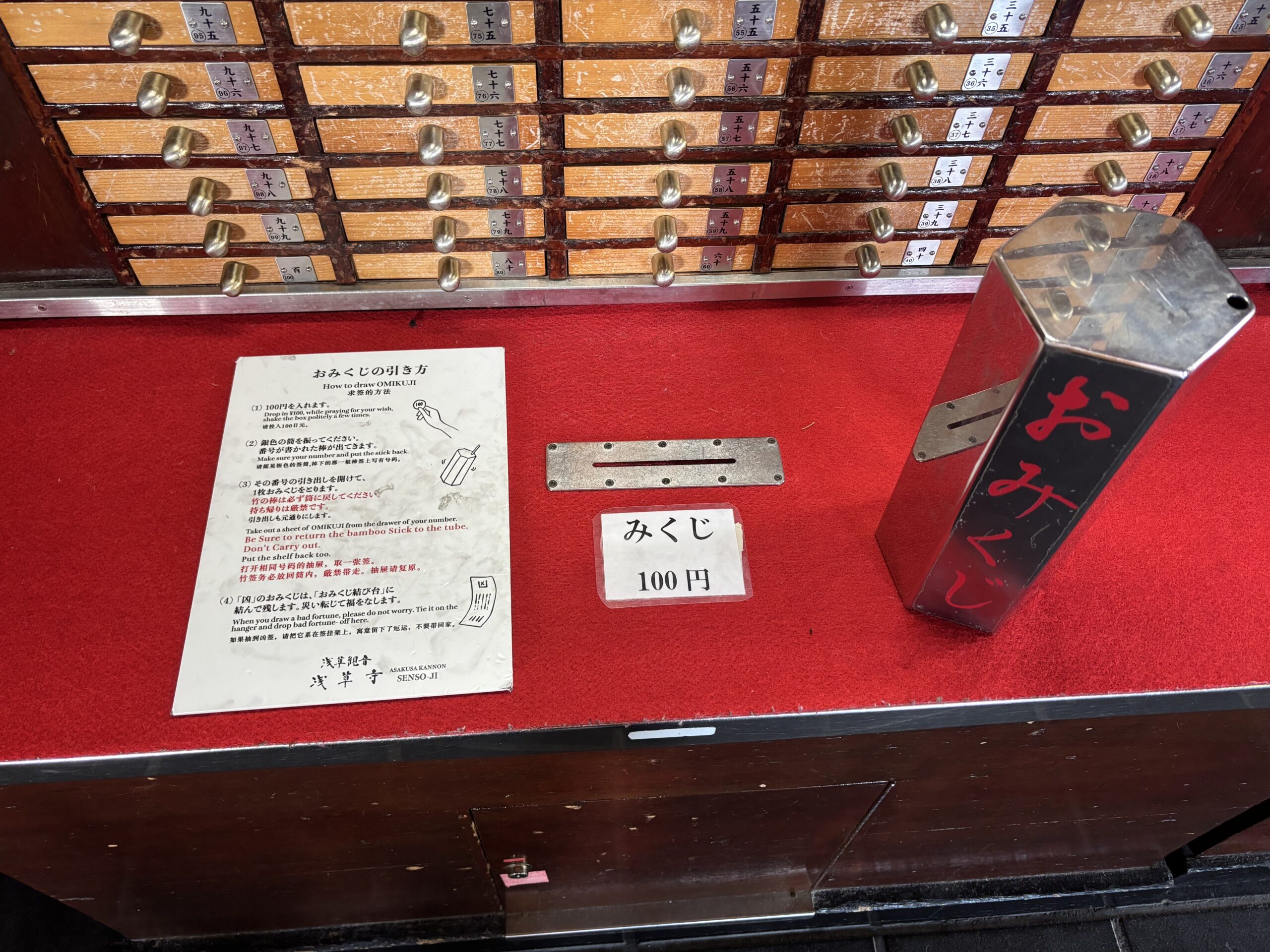 浅草寺のおみくじは、筒を振って出た番号の引き出しを開ける方式です。