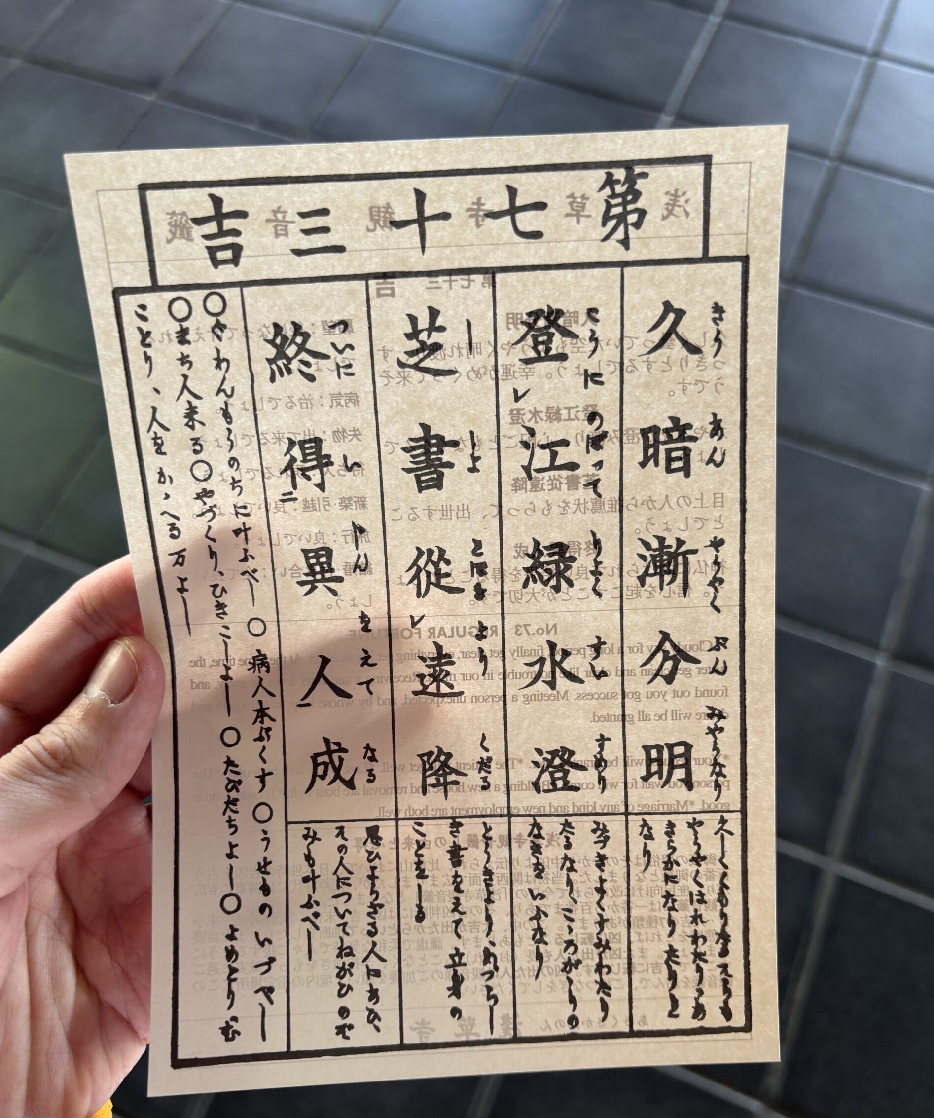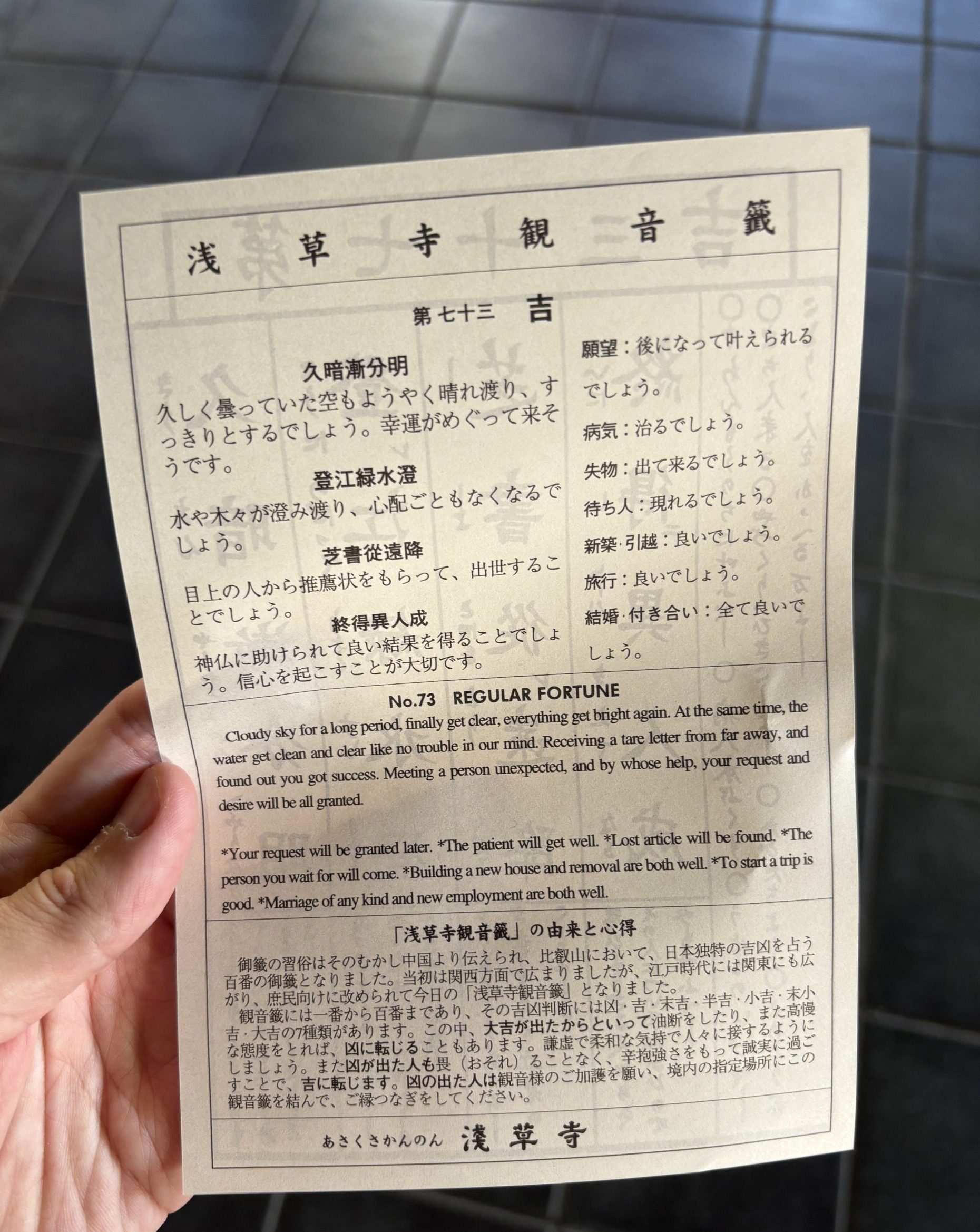 おみくじの結果は、吉でした!浅草寺のおみくじは凶が多く、全体の30%ほどが凶だと言われています。おみくじの順番は寺や神社によって異なりますが、浅草寺の場合は大吉、吉、半吉、小吉、末小吉、末吉、凶という順番に良いようです。私の場合は、吉だったので二番目に良い運勢だったということですね。