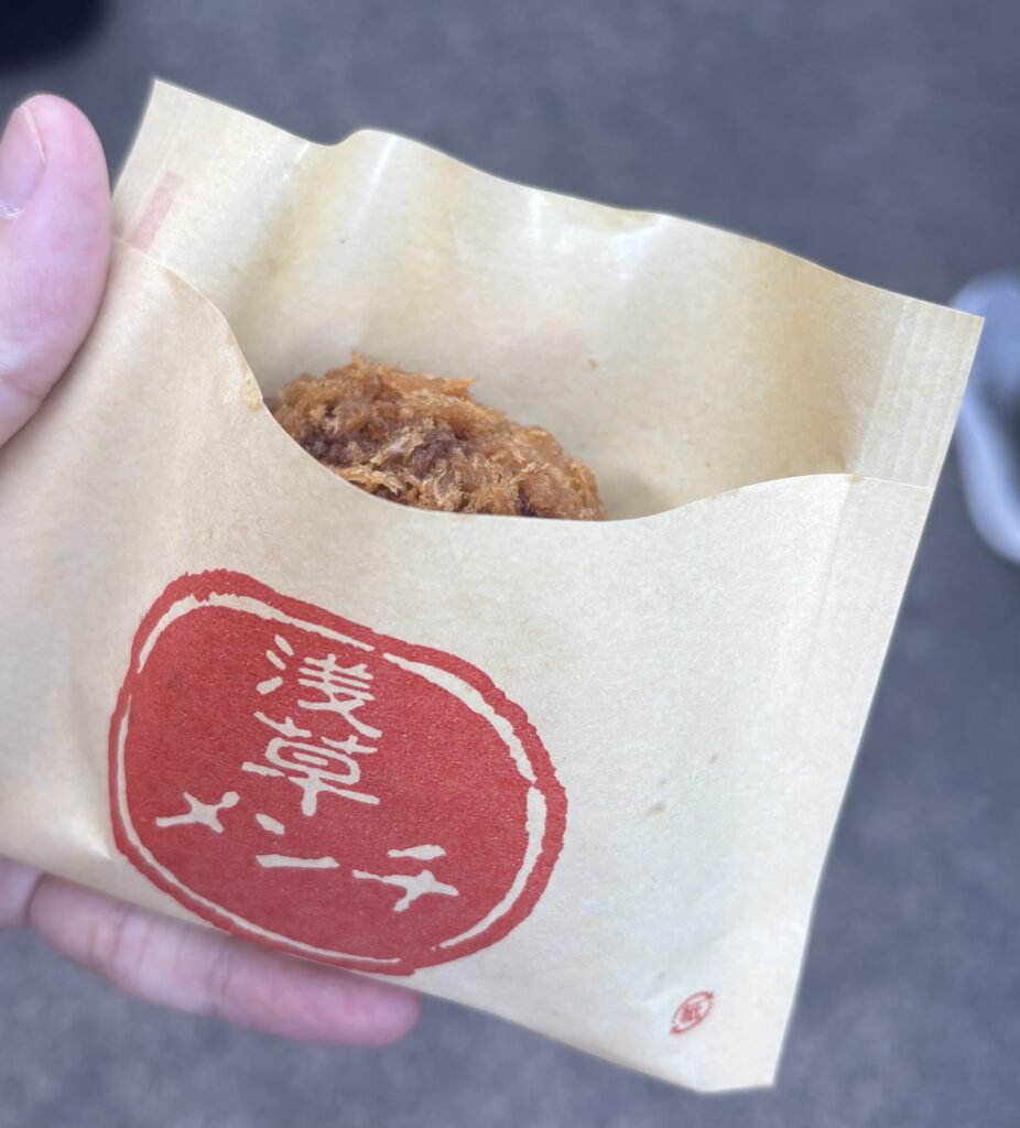 メンチカツなのですが、非常にジューシーで、一口噛むと中の肉汁が溢れ出します。普段は購入者が列になって並んでいますが、平日に行くと並ばずに変えてお得です! 大黒屋と同じく、店舗が仲見世通りと浅草寺の間の通路に面しています。