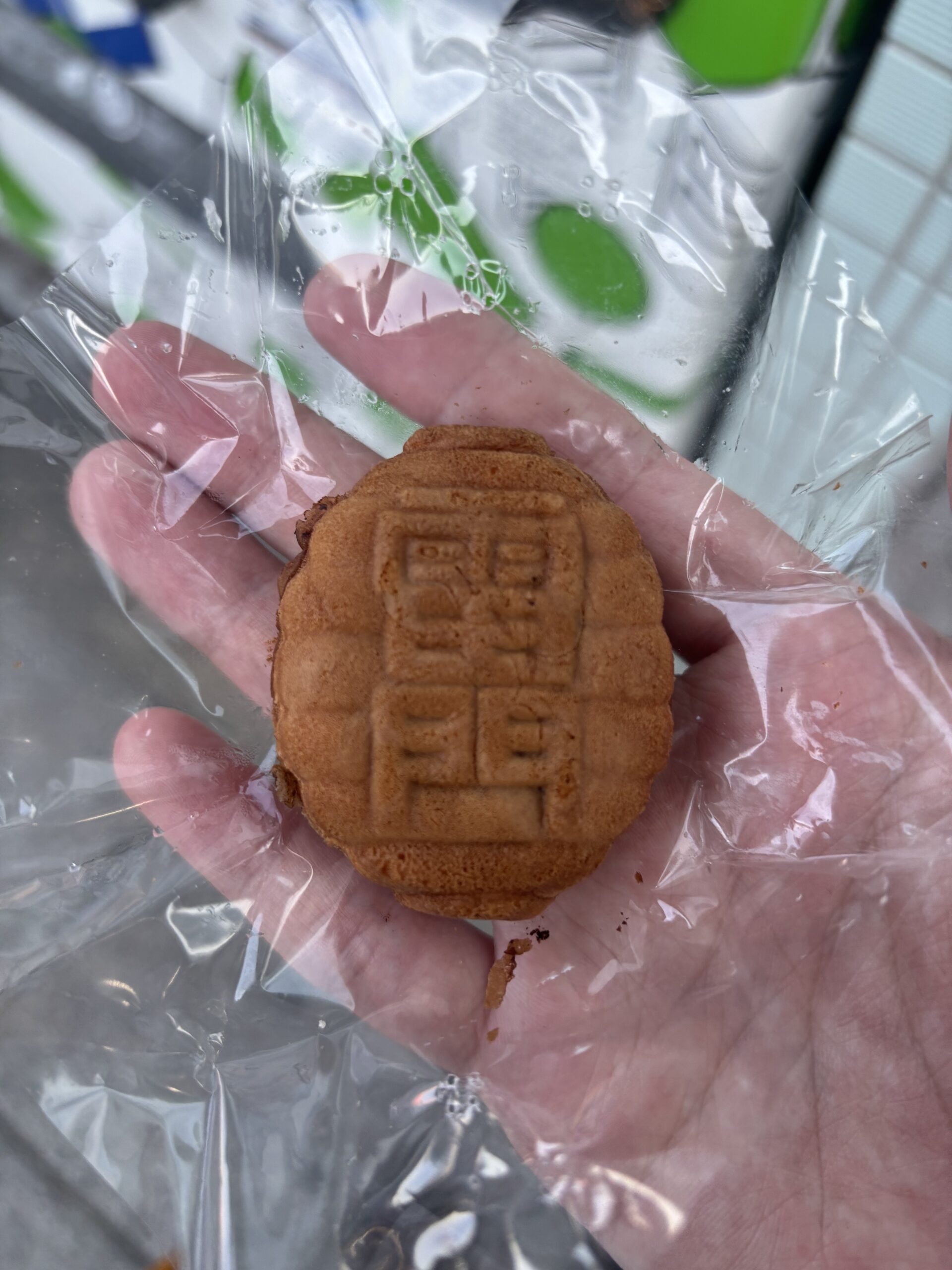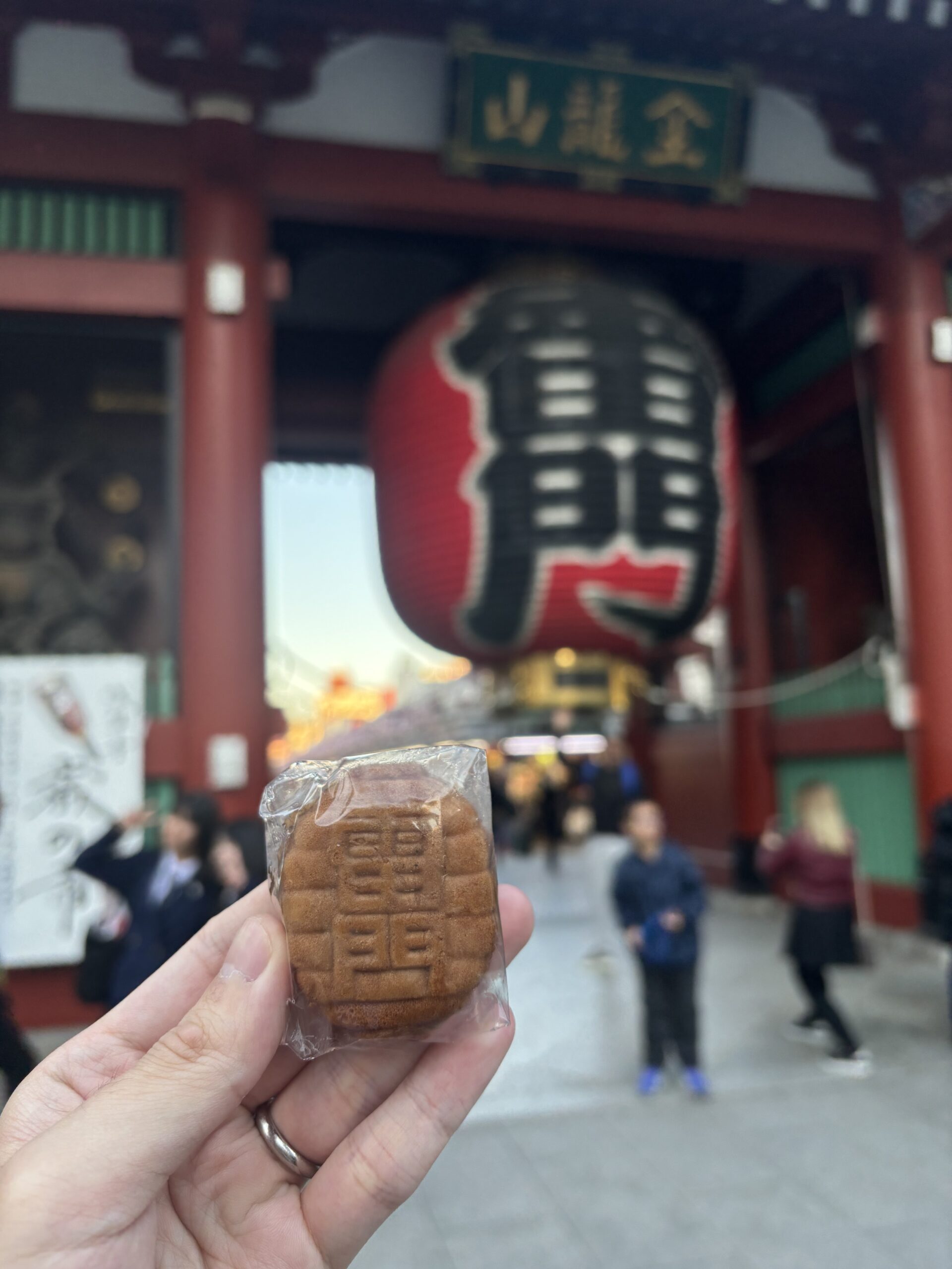 人形焼にはいろんな形がありますが、今回私が買ったのは雷門の形をしていたので、雷門と一緒に一枚。